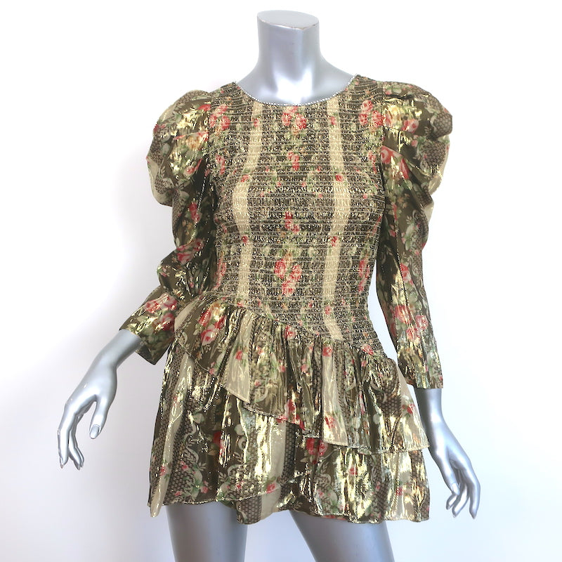 LoveShackFancy Smocked Mini Dress Greenwich Gold Floral Print Size Petite NEW