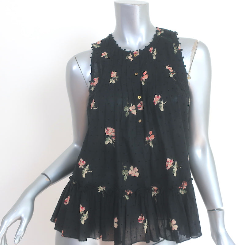 Ulla Johnson Cecile Ruffle Tank Top Black Floral Print Swiss Dot Cotton Size 2