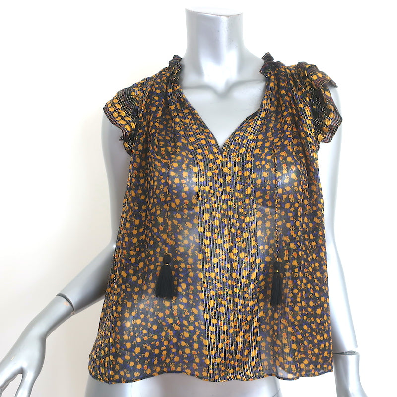 Ulla Johnson Doria Tie-Neck Top Black/Yellow Metallic Floral Print Size 0