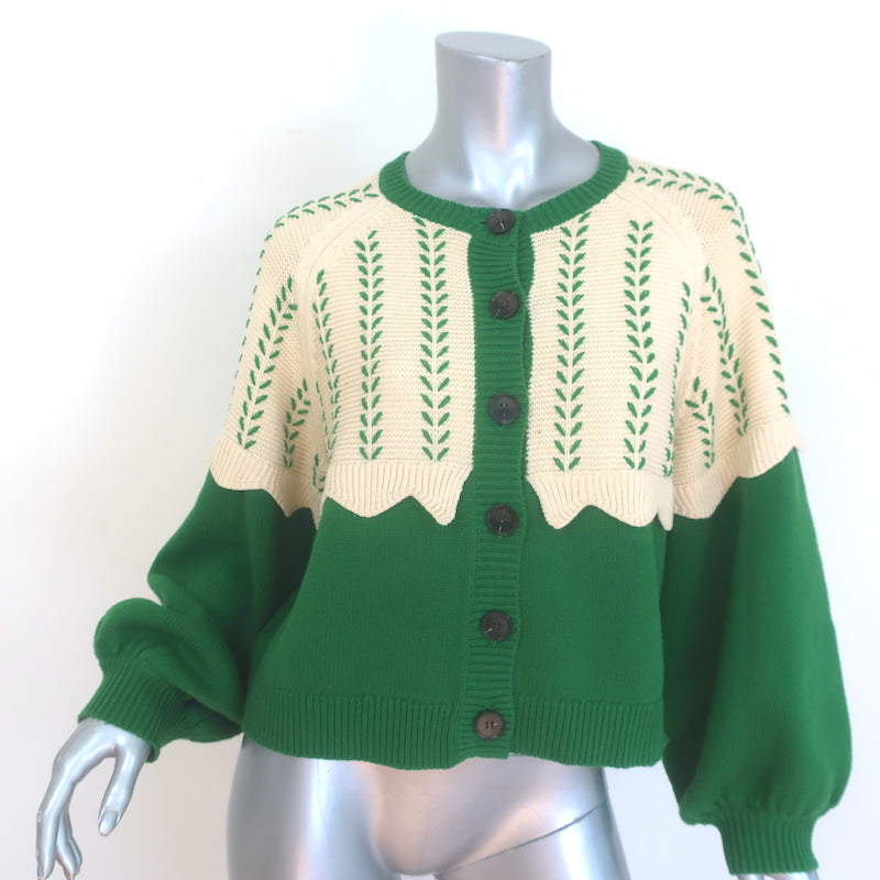 THE GREAT The Scallop Sophomore Cardigan Green/Ivory Cotton-Blend Size 2 Measurements