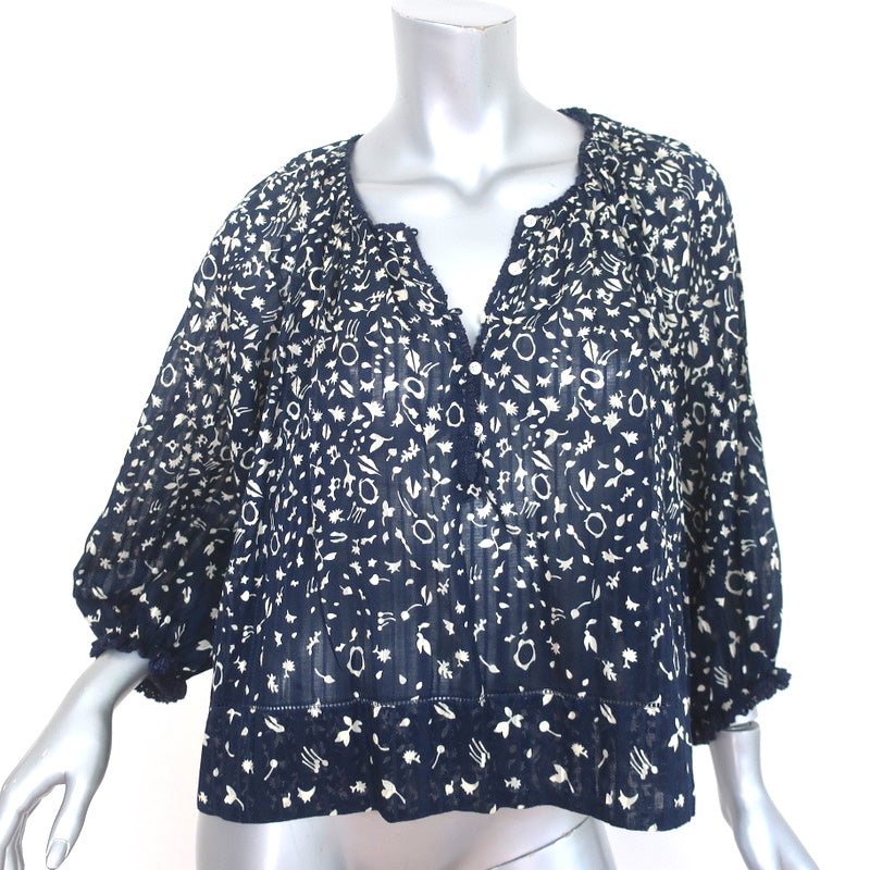 THE GREAT Top Perch Navy Printed Cotton Size 1 Ruffle-Trim 3/4 Sleeve Blouse