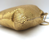 - Material: Gold-tone metal mesh exterior with a lined interior.