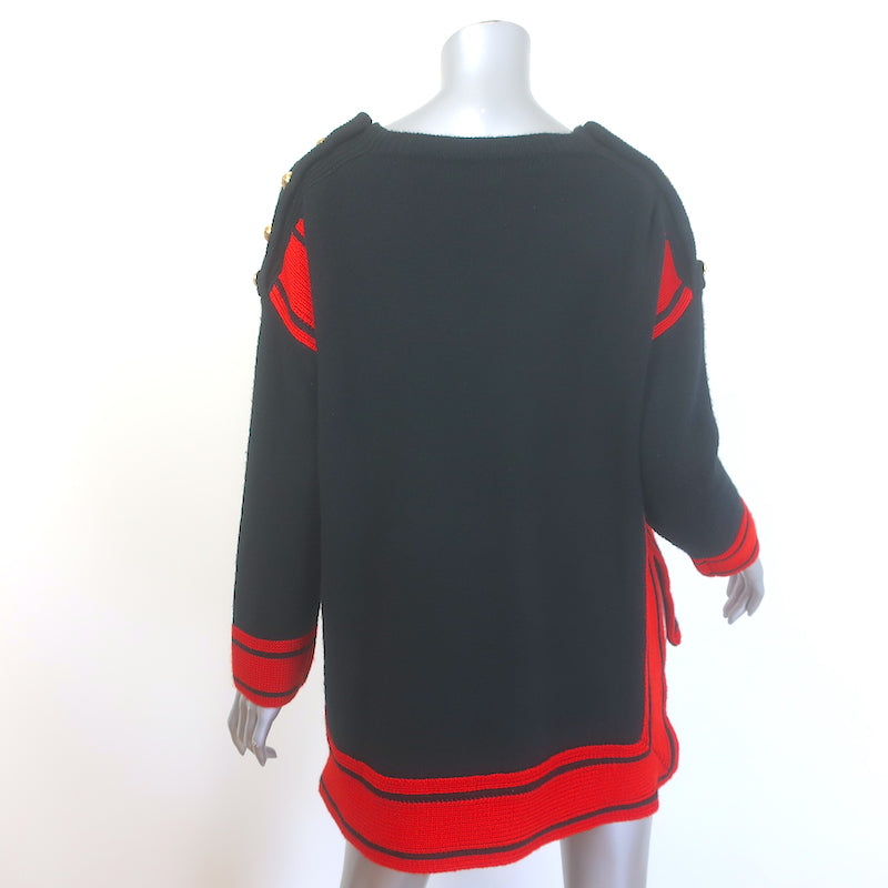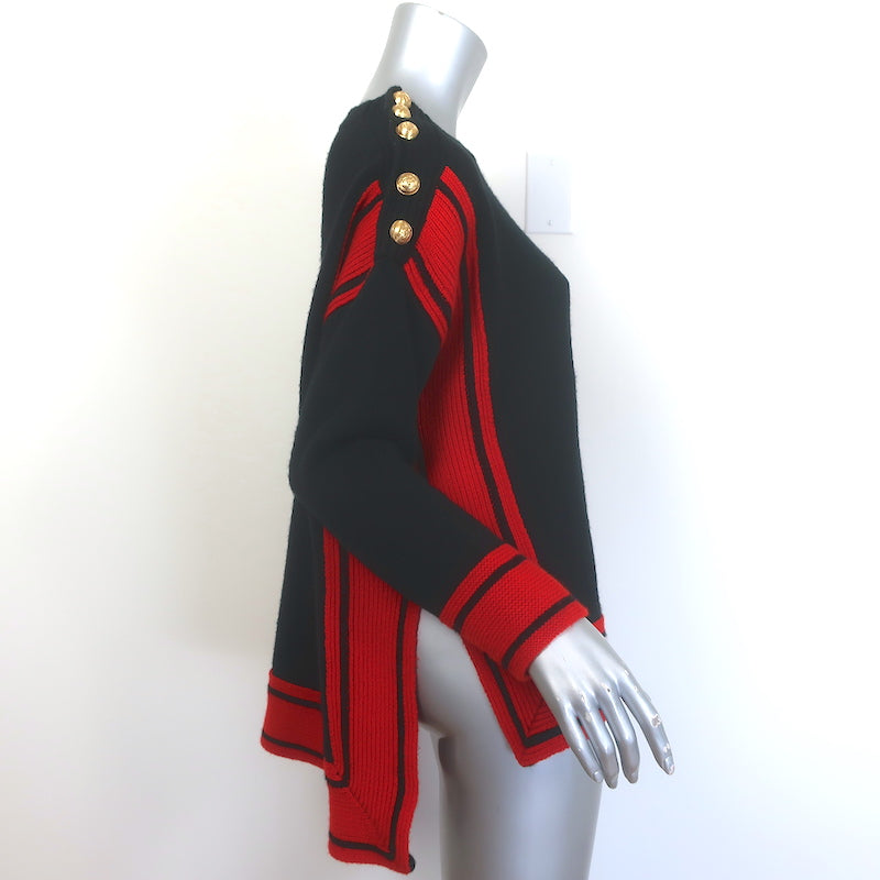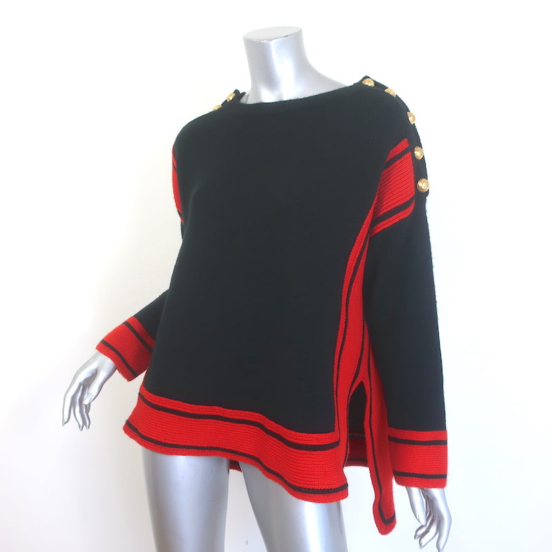 This gently worn piece is crafted from soft cashmere and features the signature buttoned-shoulder detail that gives the silhouette a distinctive, fashion-forward edge. The palette reads primarily black with red accents, making it versatile for both elevated everyday looks and more polished evening outfits.