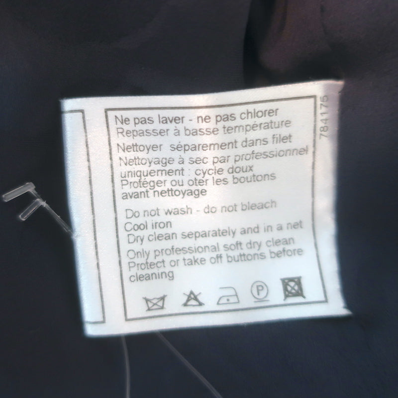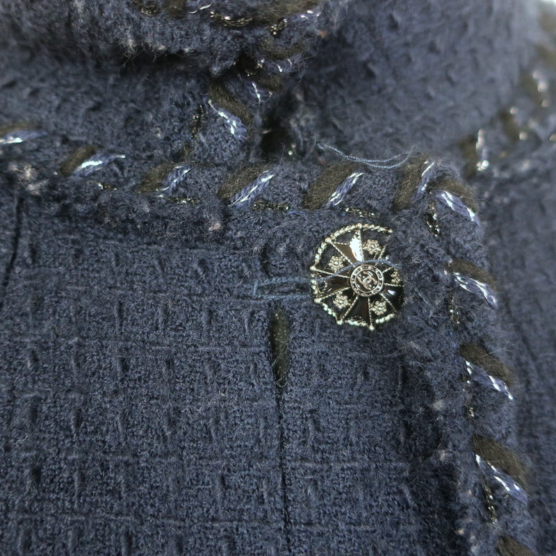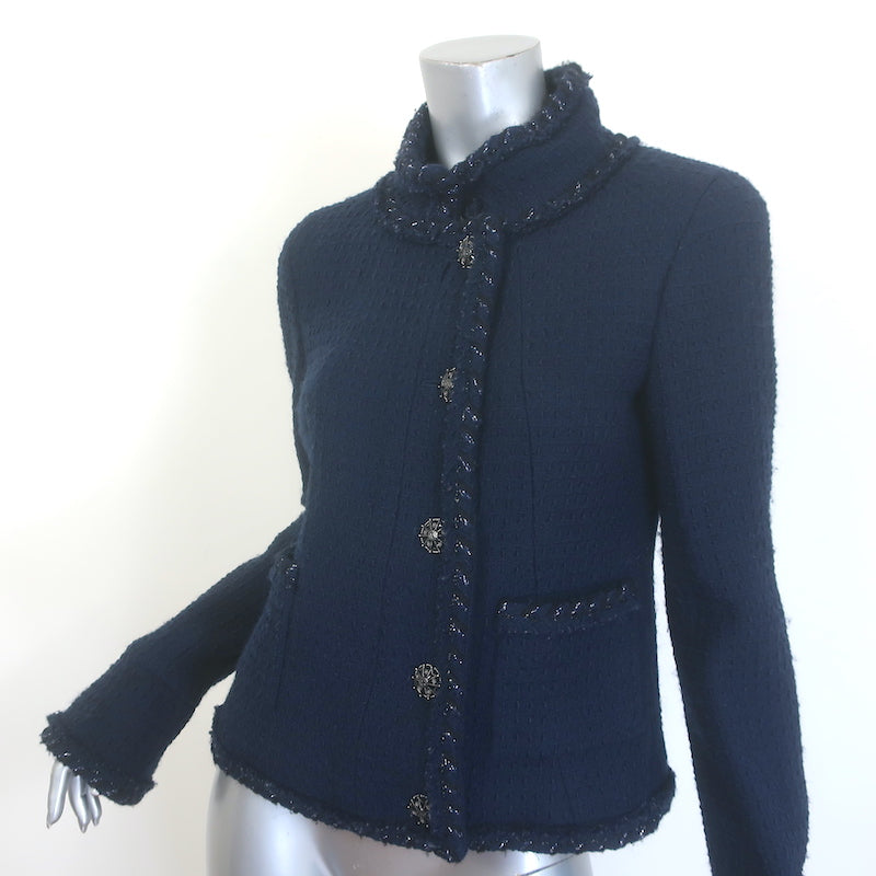 Crafted in classic Chanel tweed, this pre-owned piece combines signature detailing—CC star buttons, metallic-thread trim and artful fringing—with a rich navy wool body. The jacket is labeled size 40 and presents the structured, refined finish collectors and stylists praise in Chanel outerwear.