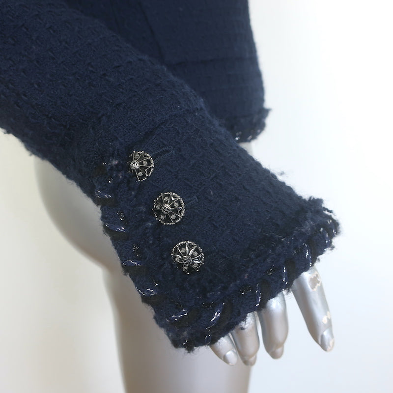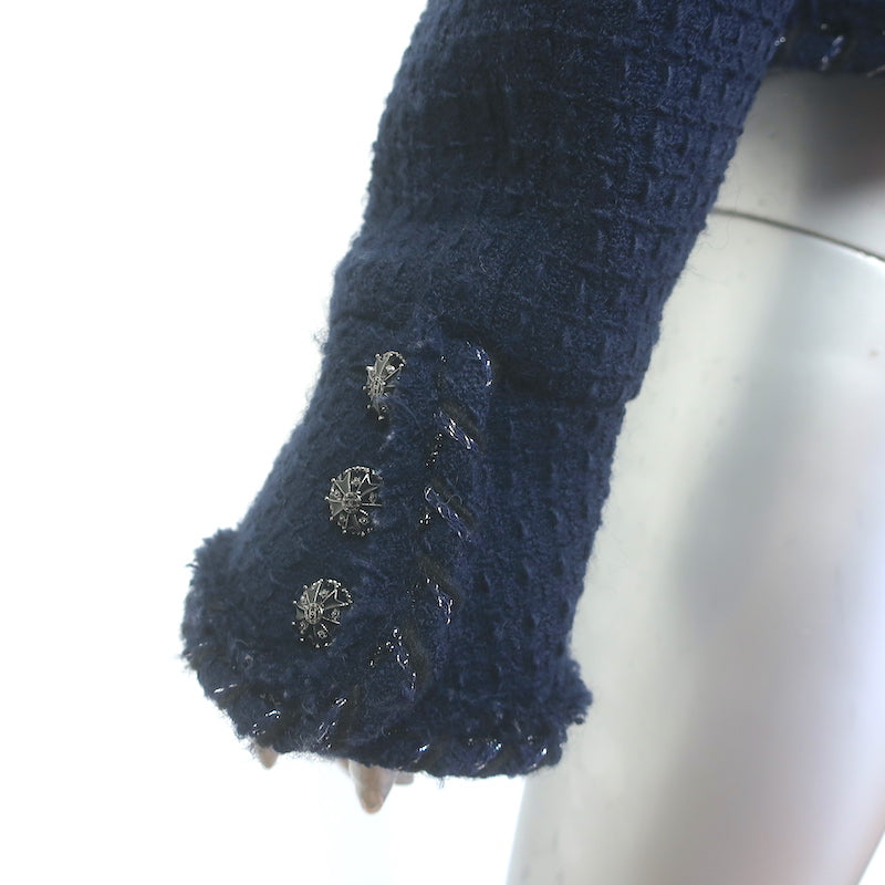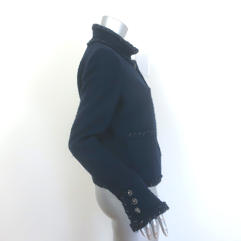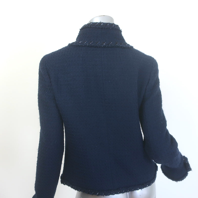 Chanel 08A CC Star Button Fringed Metallic-Trim Tweed Jacket Navy Wool Size 40