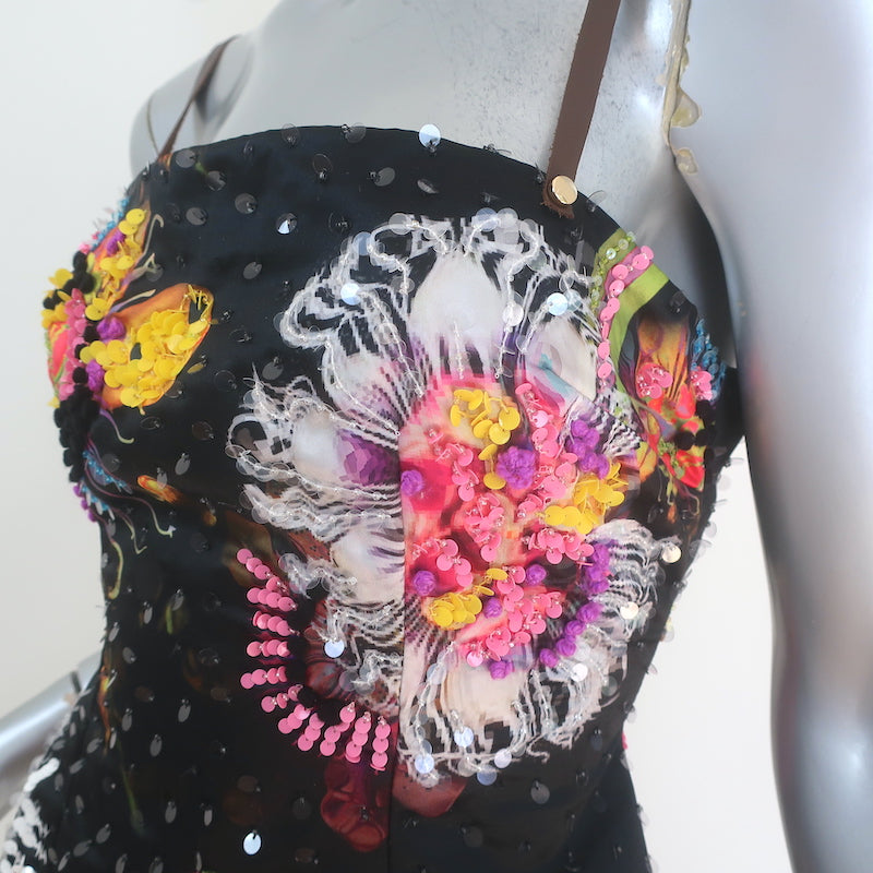 Cynthia Rowley Leather-Tie Sequined Top Black Floral Print Satin Size Small NEW
