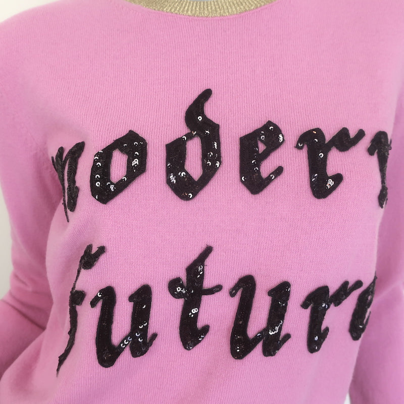 Gucci Modern Future sequin-embroidered sweater in soft pink wool (Size Small) brings a touch of runway sparkle to everyday wear while remaining unmistakably luxe and wearable.