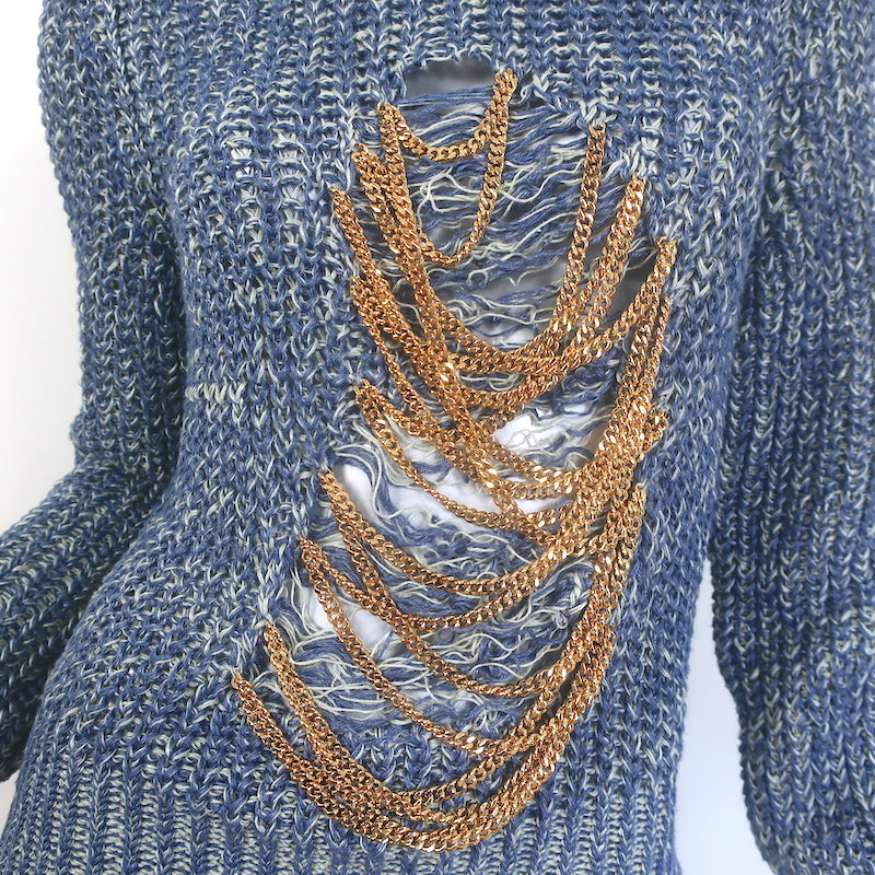 Care & styling tips: hand wash or dry clean recommended to preserve the delicate chain trim and the knit’s textured finish. Pair it with tailored trousers for a polished look or with lived-in denim for elevated everyday style.