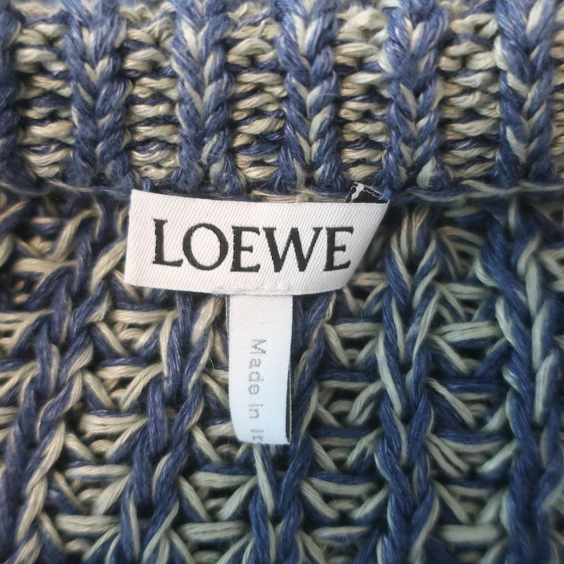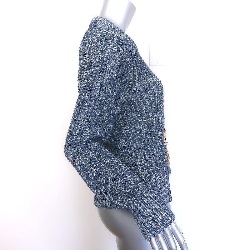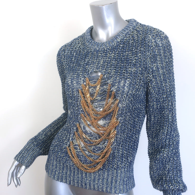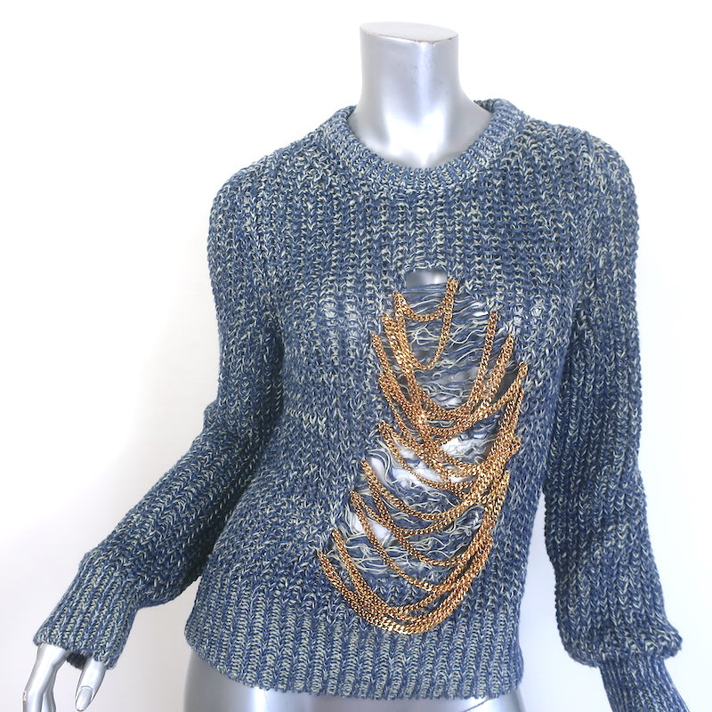 Loewe chain-embellished distressed knit sweater in blue melange (size small) offers a refined, contemporary look—marrying signature artisanal detailing with wearable luxury.