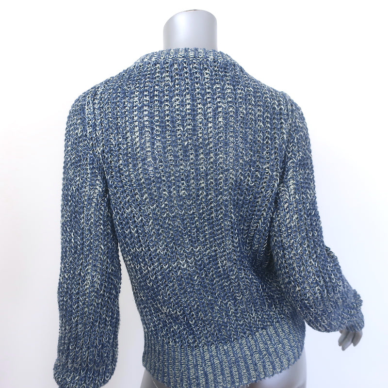 This pre-owned piece is gently worn and in great condition with no visible flaws. Designed with a soft blue melange knit and subtle distressed finishing, the sweater is accented by delicate chain embellishments that give it an elegant, edgy touch. Crafted from a breathable blend—54% hemp, 44% linen, 1% elastane, 1% polyamide—it feels lightweight and textured, ideal for layering through transitional seasons.