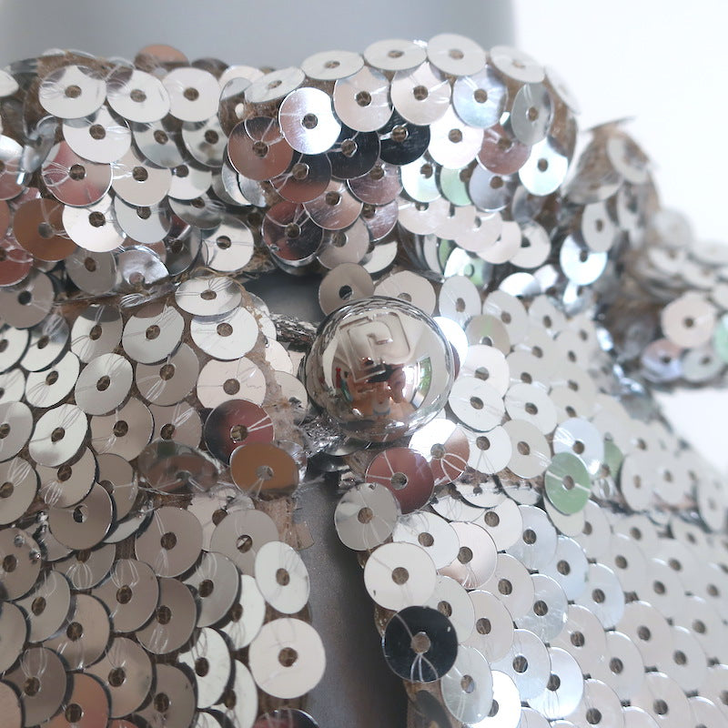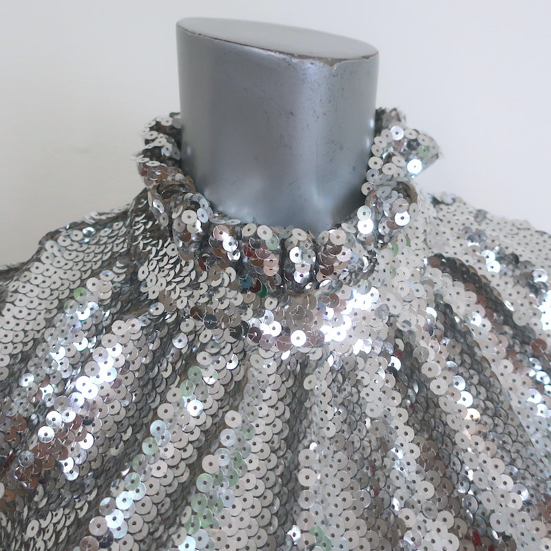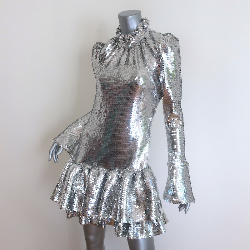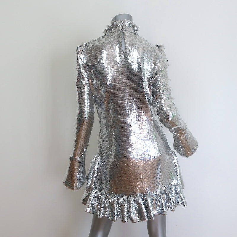 Paco Rabanne Sequined Bell Sleeve Ruffled Mini Dress Silver Size 38