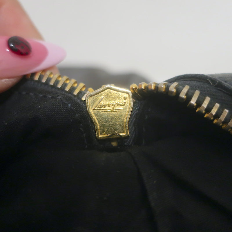Pre-loved. Good condition. A few small scratches on leather trim. Zipper pull has fallen off. Scratches on buckle. Large stain on lining....