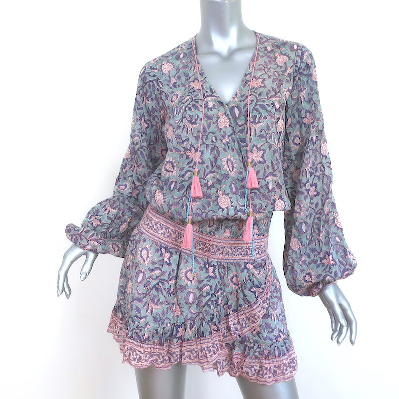 Bell Evelyn Long Sleeve Mini Dress Blue/Pink Printed Cotton-Silk Size Medium