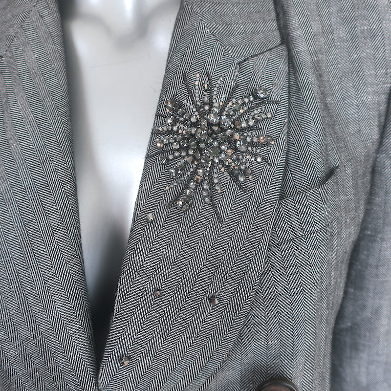 Brunello Cucinelli Monili Beaded Feather Brooch Blazer Gray Linen-Blen...