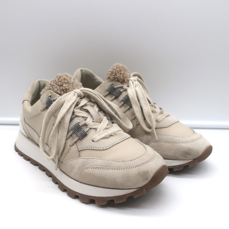 Brunello Cucinelli Shearling & Monili-Trimmed Running Sneakers Taupe Size 39