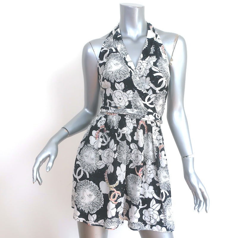 Chanel 10P Halter Mini Wrap Dress Black/White Lion CC Print Silk Size 40 Measurements