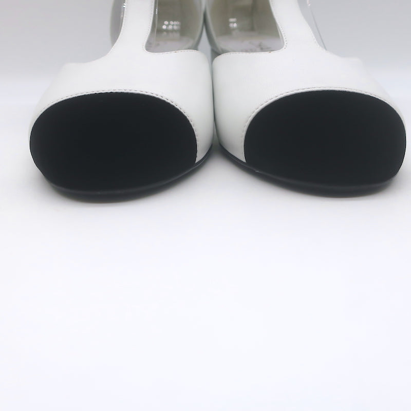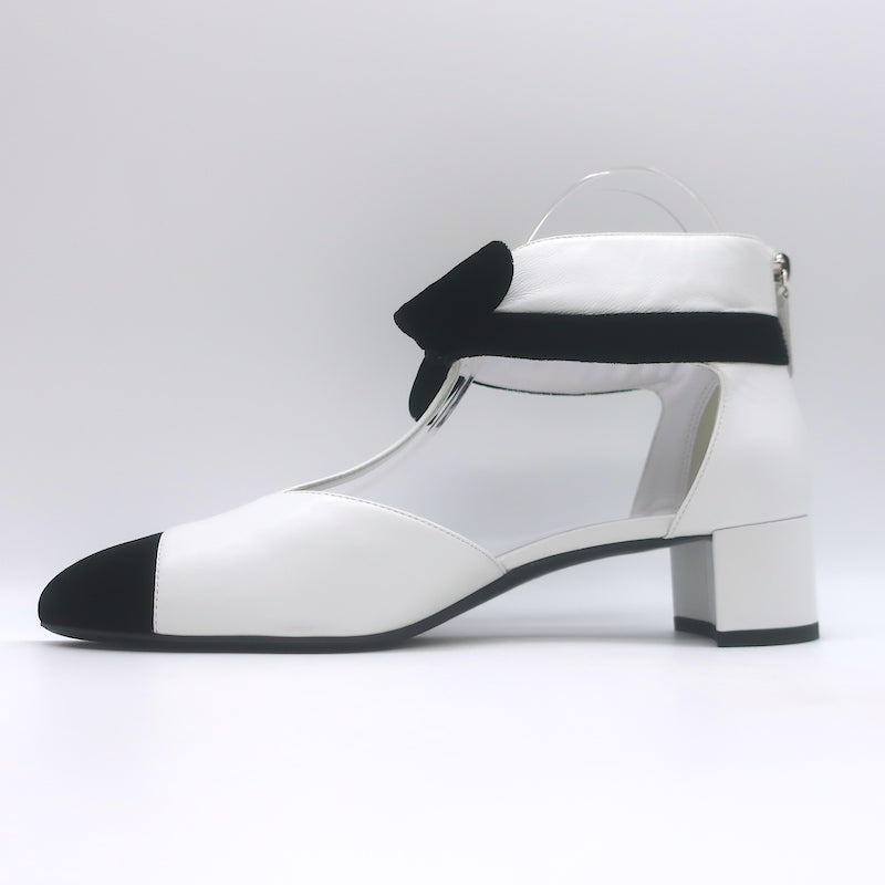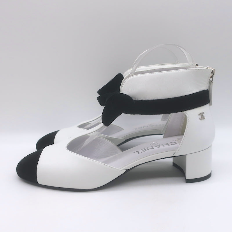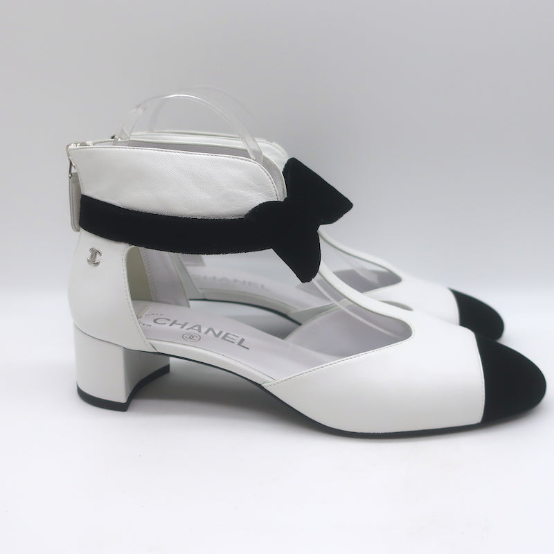 Chanel Bicolor Cap Toe T-Strap Bow Pumps White Leather & Black Velvet Size 38C