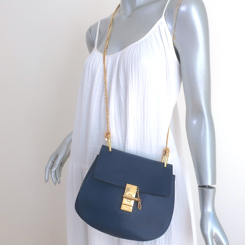 Chloe Drew Chain Strap Crossbody Bag Navy Grained Leather