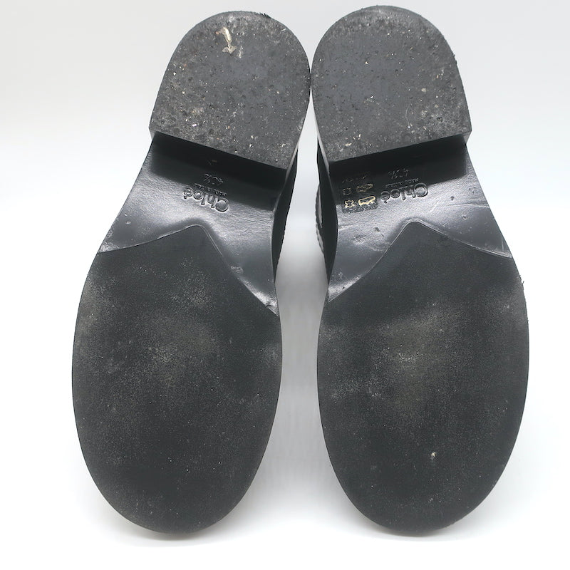 Pre-loved. Good condition. No major wear to speak of, some scuffing on rubber and interior sides of boots. 2 tiny white spots on exterior side of left boot. Small, faint scratch on right heel and 1 on each strap. Boots are slightly creased from walking. Does NOT come with box or dust bag. Boots can be worn without the straps.