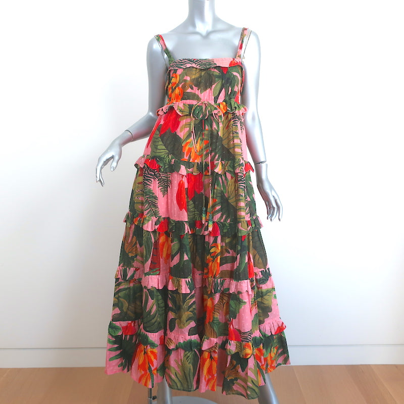 FARM Rio Tiered Maxi Dress Pink Cocoa Forest Print Cotton Size Extra Small