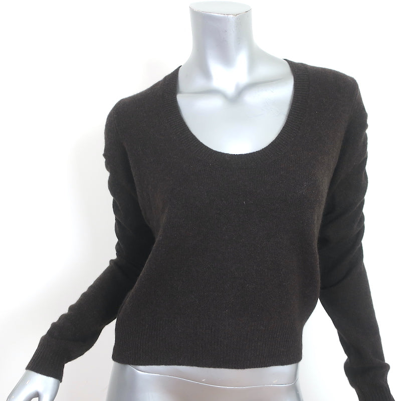FRAME Cashmere Ruched-Sleeve Sweater Dark Brown Size Small Scoop Neck Pullover Measurements