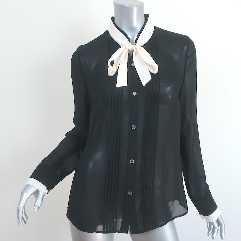 FRAME Edwardian Blouse Black Pleated Georgette Size Medium Tie-Neck Top Measurements