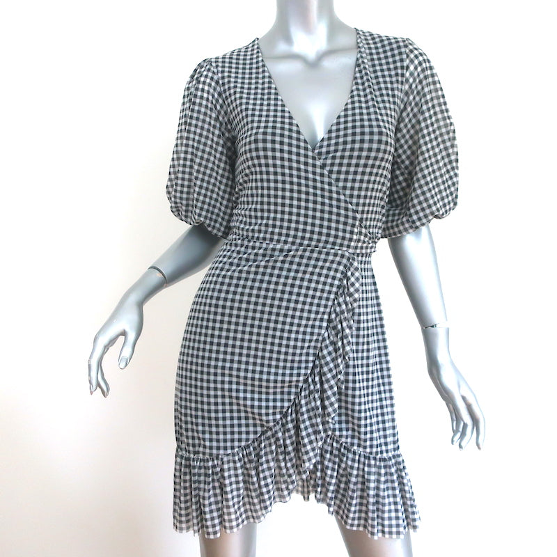 GANNI Mini Wrap Dress Ruffled Black & White Gingham Mesh Size 32 Puff Sleeve Measurements