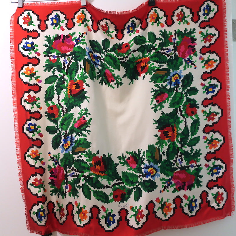 Gucci Needlepoint Floral Print Scarf Red/White Silk Twill NEW Measurements