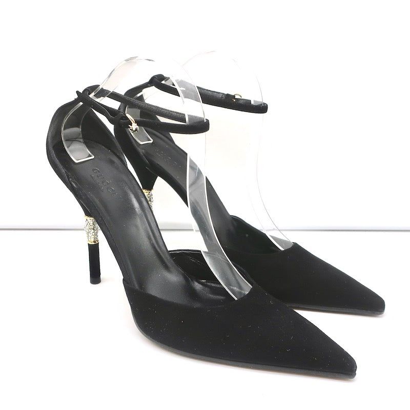 Gucci Crystal Bamboo Ankle Strap Pumps Black Suede Size 9.5 Pointed Toe Heel NEW Measurements