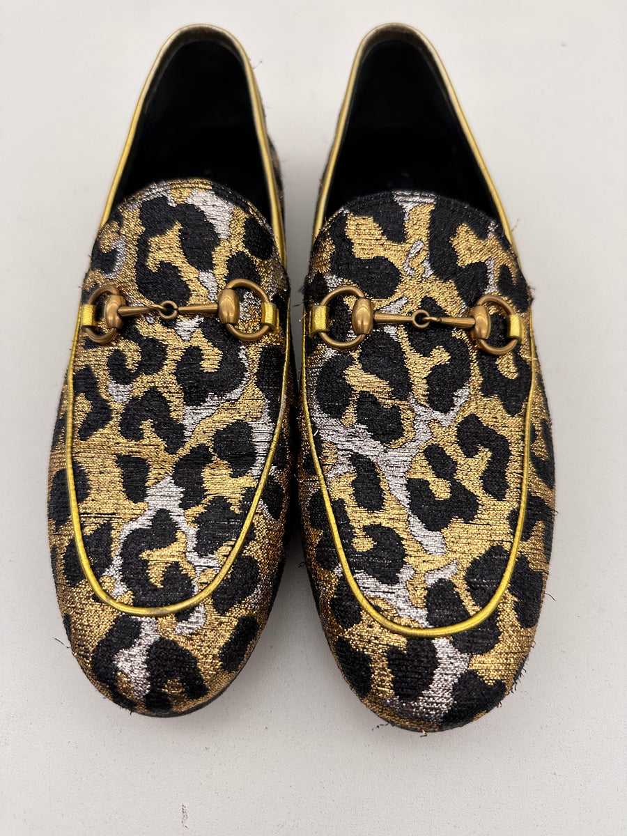 Gucci Jordaan Horsebit Loafer With Leopard Print Jacquard Sz 38.5