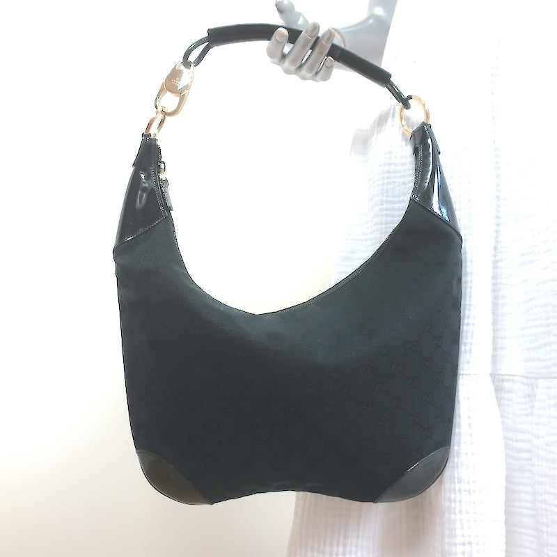 Gucci monogram hobo in black patent leather–trimmed canvas brings a refined, wearable luxury to everyday looks with a medium shoulder silhouette that balances polish and practicality.