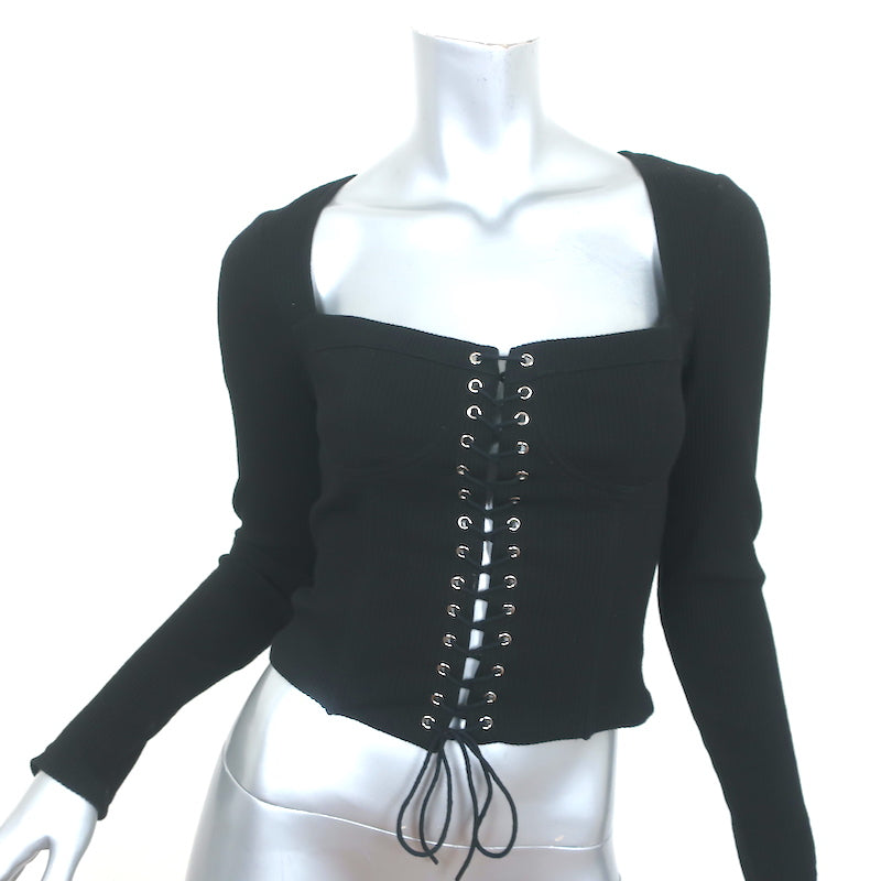 I.AM.GIA Portia Lace-Up Long Sleeve Corset Top Black Ribbed Cotton Size Small