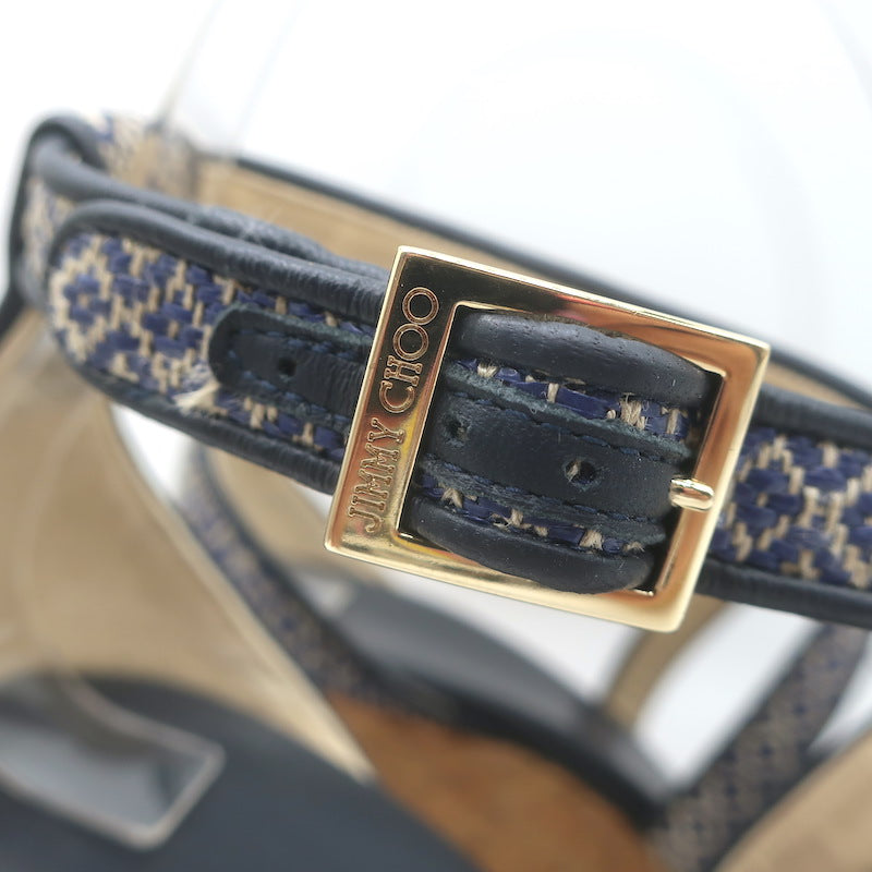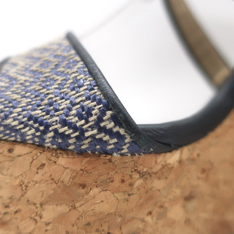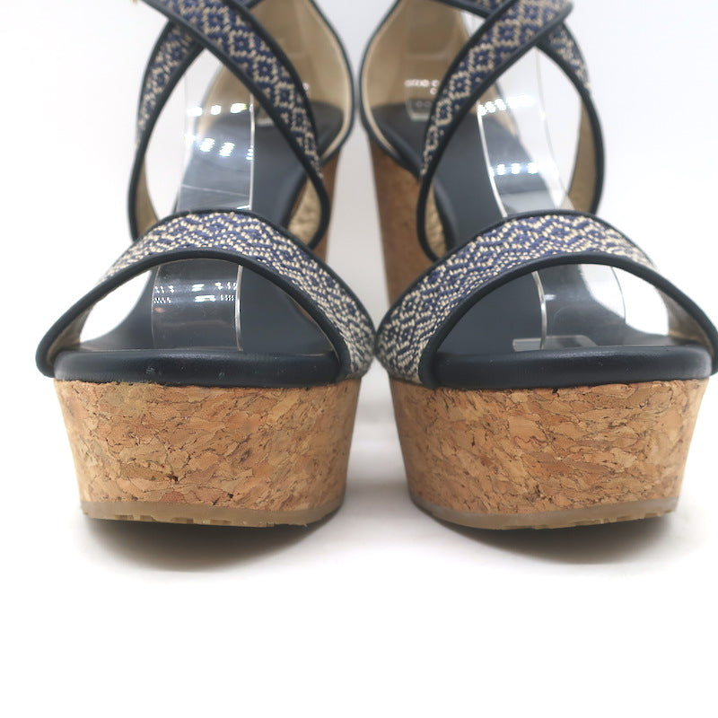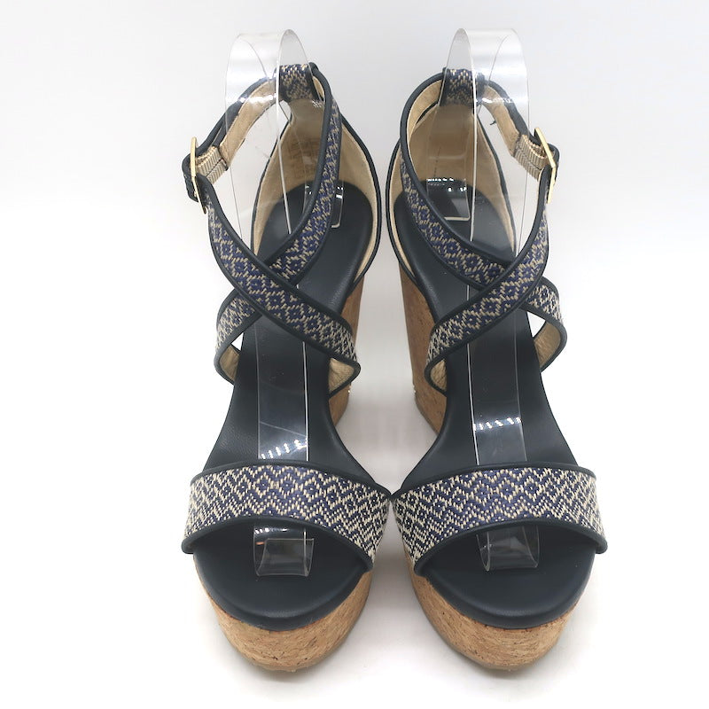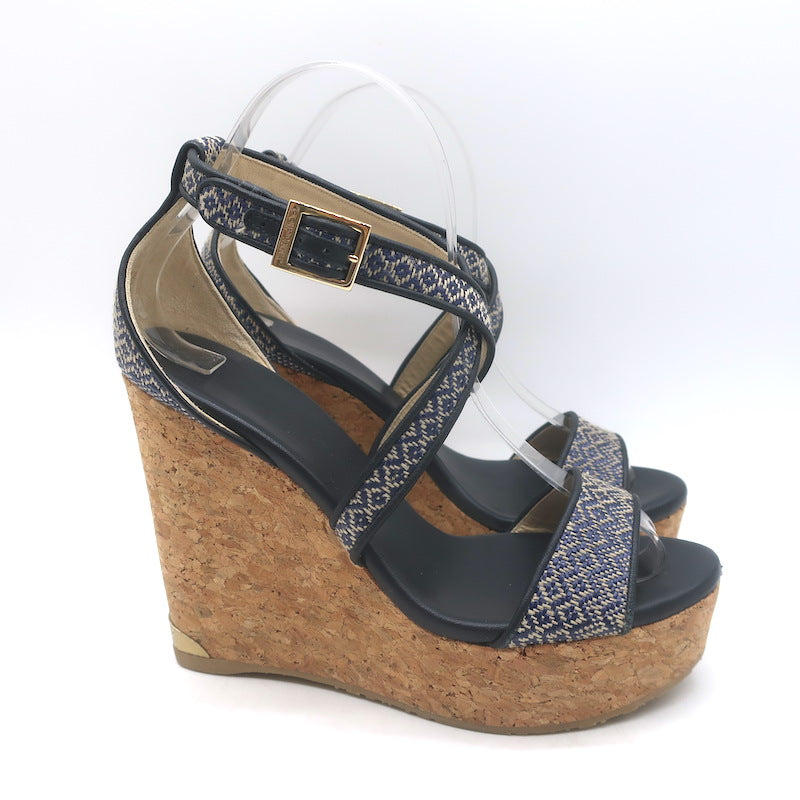 Jimmy Choo Portia Cork Platform Wedge Sandals Navy Woven Raffia Size 37.5
