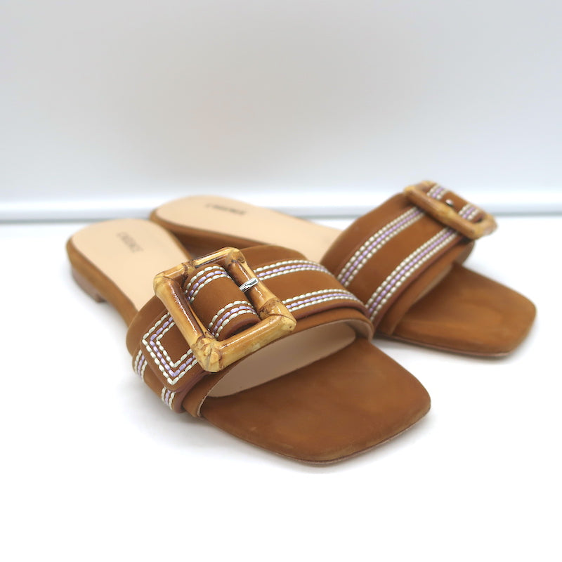 Pre-loved. Good condition. No major flaws, light wear along top edges of straps. A couple of small scuffs on interior sides of straps. Thin scratch in suede on interior side of right strap. Does NOT come with box or dustbag. Retails for $295!
