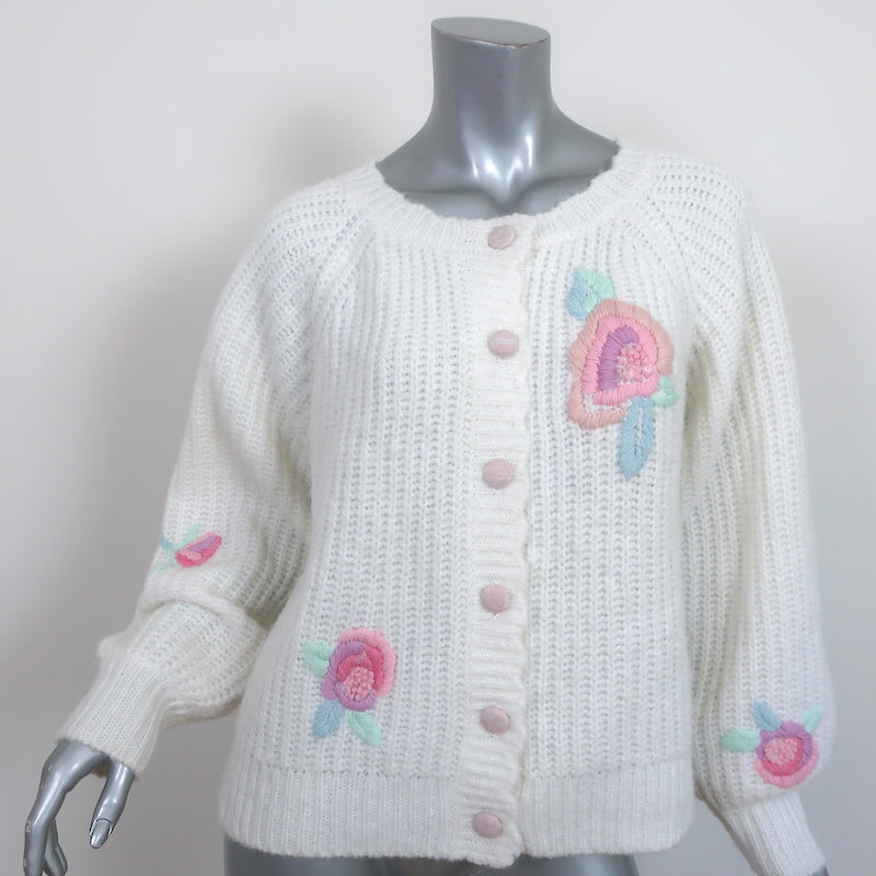 LoveShackFancy Cardigan Brookie White Floral-Embroidered Wool Blend Size Small
