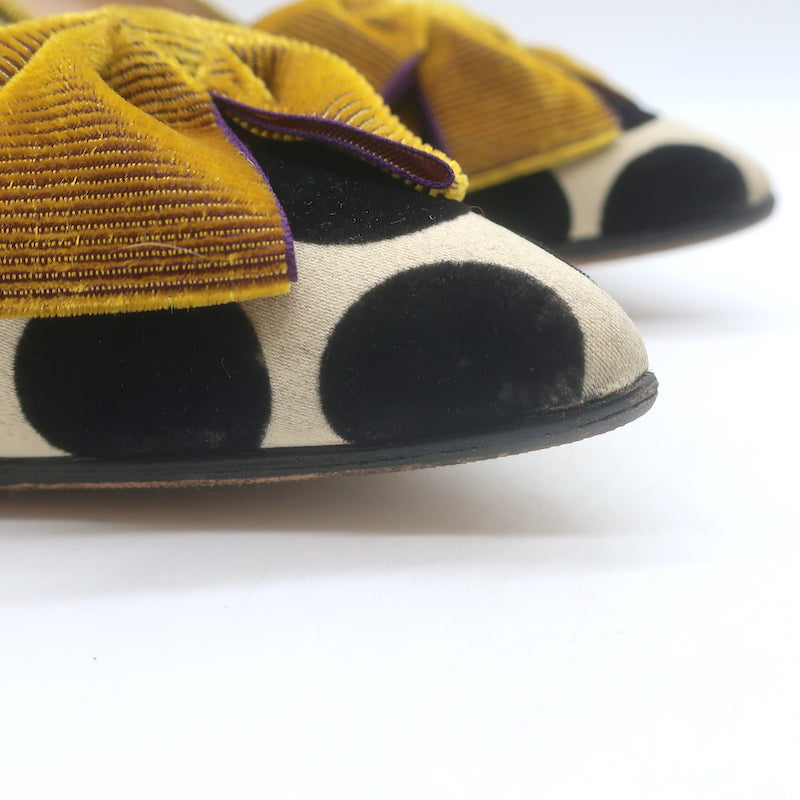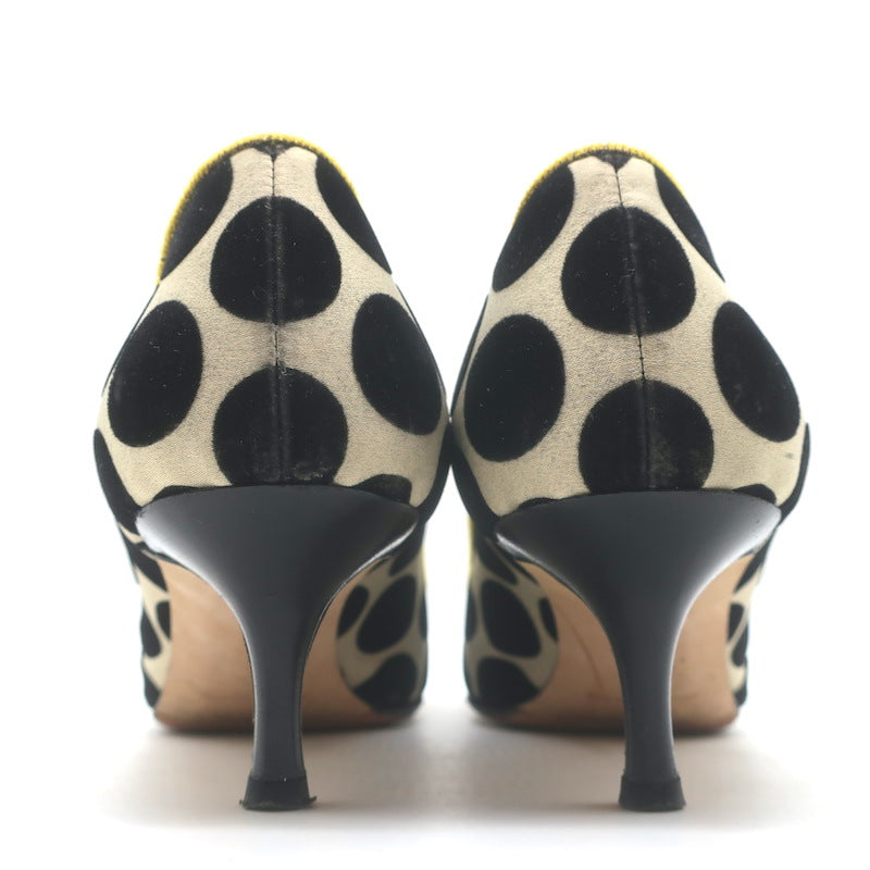 Pre-loved. Good condition. No major flaws, light wear on velvet on toes, heels and sides of shoes along soles. Small gray scuff on right heel. Faint gray smudging on insoles. Rubber soles have been added for extra traction. Does NOT come with box or dust bag. Retails for $825!