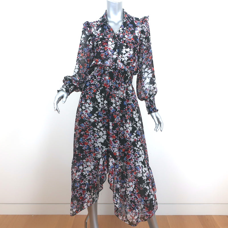 MISA Midi Dress Katja Black Floral Print Ruffled Chiffon Size Small Long Sleeve Measurements