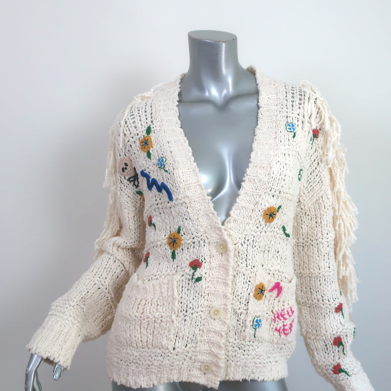 MOTHER The Easy Drop Fringe Cardigan Cream Embroidered Knit Size Small Measurements