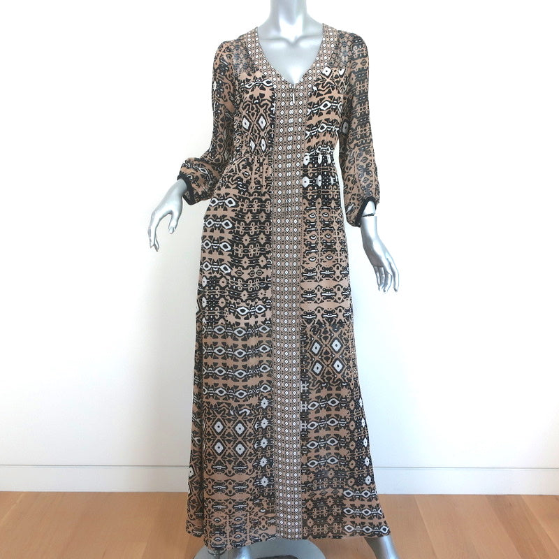 Nanette Lepore Maxi Dress Apache Beige Printed Silk Size 2 V-Neck 3/4 Sleeve
