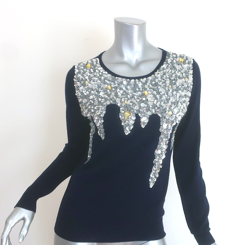 Oscar de la Renta Sequin & Jewel-Embellished Sweater Navy Wool Size Extra Small