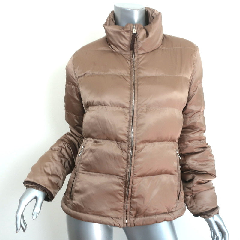 Prada Down Puffer Jacket Brown Leather-Trim Nylon Sateen Size 46