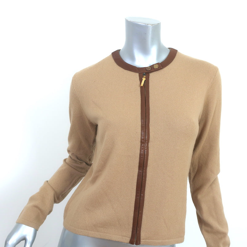Ralph Lauren Black Label Leather-Trim Cashmere Sweater Jacket Beige Size Large