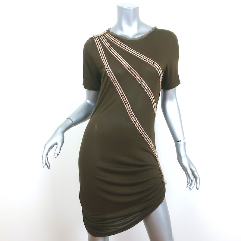 Roberto Cavalli Chain-Embellished Mini Dress Olive Ruched Jersey Size 44