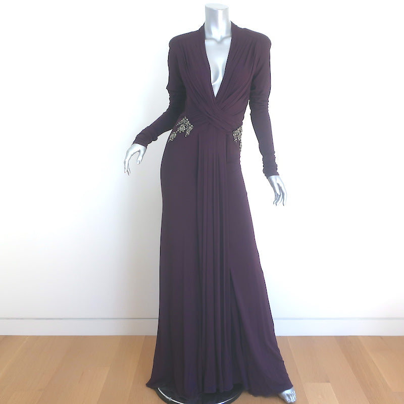 Roberto Cavalli Crystal-Embellished Deep V-Neck Gown Eggplant Jersey Size 40 Measurements