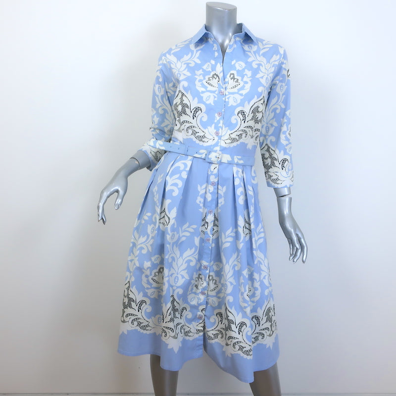 Samantha Sung Belted Shirtdress Light Blue Printed Stretch Cotton Size 8