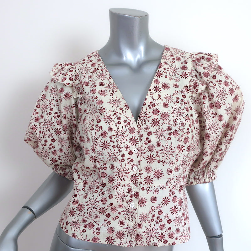 Sandro Puff Sleeve Top Miranda Cream/Red Sun Print Size 2 Button-Up Blouse