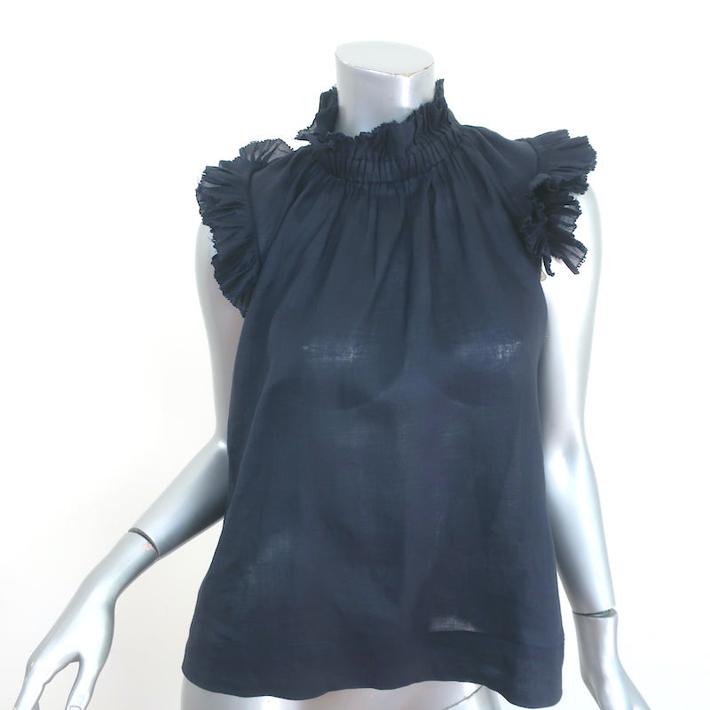 SEA Flutter Sleeve Top Navy Ramie Size 6 High Neck Blouse Measurements