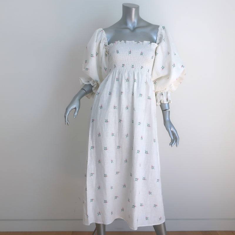 Sleeper Atlanta Smocked Midi Dress White Floral Print Linen Size Extra Small NEW