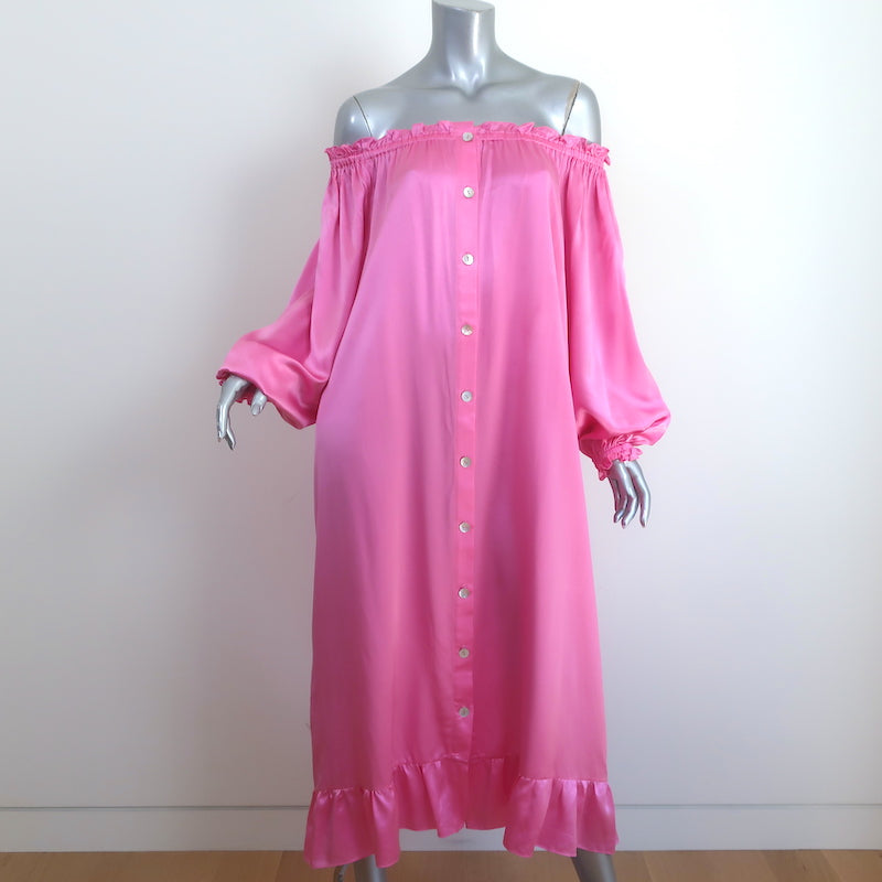 Sleeper Ruffled Off the Shoulder Midi Dress Zephyr Pink Silk Satin Size 1 Measurements