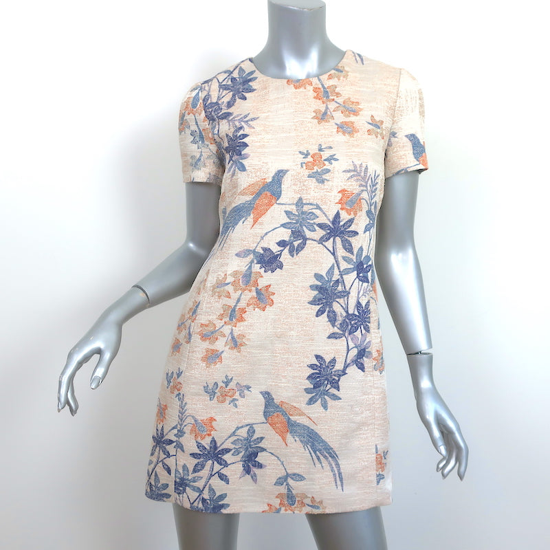 Tory Burch Short Sleeve Mini Shift Dress Beige Floral Bird Print Size 4 Measurements